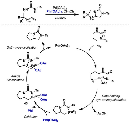 The Muniz group has been a leader in the development of both intra- and intermolecular approaches to alkene diamination via Pd(II)/Pd(IV) catalysis [42]. Their first report in this area involved the intramolecular diamination of terminal alkenes with urea derivatives, a particularly challenging transformation due to the high coordinating ability of these substrates to palladium (Scheme 22) [43]. Their method had broad scope and gave the bicyclic 1,2-diamine products in excellent yields. They note that the choice of oxidant was critical and only PhI(OAc)2 was able to promote the reaction with high efficiency. A subsequent mechanistic investigation showed the reaction proceeds via rate limiting aminopalladation, followed by oxidation to give Pd(IV) intermediate 43, which then undergoes SN2-type displacement by the second amine [44]. This catalytic cycle is supported by stoichiometric studies conducted in their group (employing PhI(OAc)2 as the oxidant), which showed that C–N bond formation proceeded via ligand ionization and subsequent SN2-displacement rather than a concerted reductive elimination from Pd(IV) [45]. This general catalytic cycle is invoked for their subsequent applications in both intra- and intermolecular amination reactions.