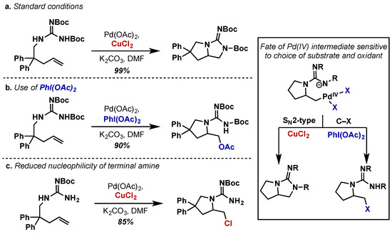 Intramolecular alkene diamination with guanidines. Reactivity of Pd(IV) intermediate sensitive to both substrate and oxidant selection. (a) Standard conditions with CuCl2 as oxidant (b) Use of PhI(OAc)2 as oxidant (c) Terminal amine with CuCl2.