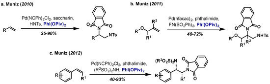 Extending this approach to intermolecular diamination was challenging as C–O bond forming reductive elimination formation would be more competitive relative to a slower intermolecular SN2 amine displacement. In three reports, the Muniz group succeeded in addressing this challenge in the intermolecular diamination of terminal alkenes, allyl ethers, and finally internal styrene derivatives with phthalimide, saccharide or N-fluoro-bis(phenylsulfonyl)imide (NFSI) as the amine sources (Scheme 24) [49,50,51]. In all cases, PhI(OPiv)2 was employed as the hypervalent iodine oxidant as PhI(OAc)2 gave very low yields with a range of palladium catalysts. The use of the more sterically encumbered PhI(OPiv)2 is presumably critical to address the issue of competitive C–O reductive elimination as the –OPiv group will undergo this process much slower than the corresponding –OAc, allowing intermolecular SN2 displacement to occur. It is noteworthy than a similar approach from Michael utilized NFSI as both the amine source and external oxidant, circumventing competitive C–X reductive elimination [52,53].