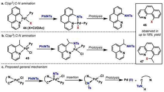 Sanford reported a study of C(sp2) and C(sp3)–H bond amination using Pd(II) catalysts and PhI=NTs as the oxidant in a stoichiometric context (Scheme 25) [54]. Using various palladacyclic species 44, 45, generated via directed C–H activation, they found that C–H insertion happens readily upon oxidation with PhI=NTs. In both cases, byproducts arising from competitive C–X bond forming reductive elimination were observed in up to 18% yield (compounds 46, 47), and this was highly dependent on reaction conditions. Oxidant electronics were found to play a role in the rate of C–H insertion; altering the substituents on the benzylsulfonamide PhINSO2C5H4X (X = OMe/NO2) led to prolonged reaction times. The authors refrain from drawing mechanistic conclusions from this data due to the highly varied solubility and hydrolytic instability of the hypervalent iodine reagents under the reaction conditions. A general mechanism is shown in Scheme 25c, and the intermediacy of Pd(IV) is supported by the observation of C–X reductive elimination products. Direct C–H activation/amination could also be achieved at sp3 C–H bonds, however isolated yields upon protolysis were lower relative to sp2 analogues. It should be noted that a catalytic approach to C–H bond amination has been reported using K2S2O8 as a stoichiometric oxidant [55].