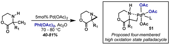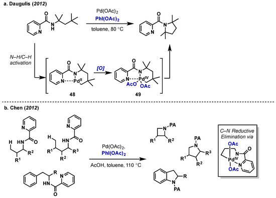 Daugulis provided the first report of catalytic alkyl-nitrogen coupling via C–H activation with Pd(II)/Pd(IV), which relied on oxidation with PhI(OAc)2 (Scheme 26a) [56]. Other oxidants screened included more electron-deficient λ3-iodanes PhI(OTFA)2, PhI(p-NO2C6H4O2C)2, as well as AgOAc, all of which gave very low or no conversion. The net intramolecular C–H amination proceeded via consecutive N–H/C–H activation, oxidation of complex 48 to give Pd(IV) intermediate 49, and final C–N bond forming reductive elimination. Mechanistic insights into the C–N bond forming step were not provided. This work was followed closely by that of Chen who used the picolinamide directing group for the construction of diverse 4- and 5-membered nitrogen heterocycles via C(sp3)–H amination (Scheme 26b) [57].