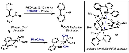 - Powers, D.C.; Benitez, D.; Tkatchouk, E.; Goddard, W.A.; Ritter, T. Bimetallic reductive elimination from dinuclear Pd(III) complexes. J. Am. Chem. Soc. 2010, 132, 14092–14103. [Google Scholar] [CrossRef] [PubMed]
