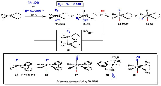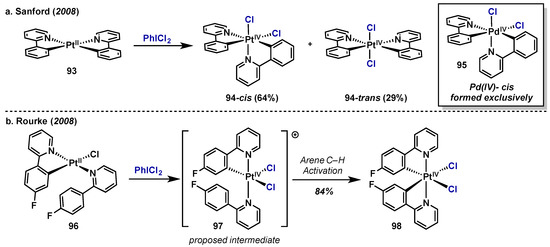 - Canty, A.J. Organopalladium and platinum chemistry in oxidising milieu as models for organic synthesis involving the higher oxidation states of palladium. Dalton Trans. 2009, 10409–10417. [Google Scholar] [CrossRef] [PubMed]