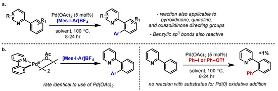 - Deprez, N.R.; Sanford, M.S. Synthetic and mechanistic studies of Pd-catalyzed C-H arylation with diaryliodonium salts: Evidence for a bimetallic high oxidation state Pd intermediate. J. Am. Chem. Soc. 2009, 131, 11234–11241. [Google Scholar] [CrossRef] [PubMed]