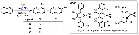 - Hickman, A.J.; Sanford, M.S. Catalyst Control of Site Selectivity in the Pd II/IV-Catalyzed Direct Arylation of Naphthalene. ACS Catal. 2011, 1, 170–174. [Google Scholar] [CrossRef]