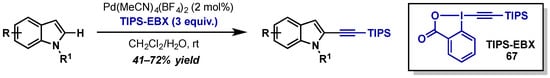 - Brand, J.P.; Charpentier, J.; Waser, J. Direct alkynylation of indole and pyrrole heterocycles. Angew. Chem. Int. Ed. 2009, 48, 9346–9349. [Google Scholar] [CrossRef] [PubMed]
