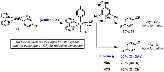 - Ball, N.D.; Kampf, J.W.; Sanford, M.S. Aryl–CF3 Bond-Forming Reductive Elimination from Palladium(IV). J. Am. Chem. Soc. 2010, 132, 2878–2879. [Google Scholar] [CrossRef] [PubMed]