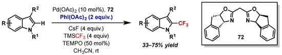 - Mu, X.; Chen, S.; Zhen, X.; Liu, G. Palladium-Catalyzed Oxidative Trifluoromethylation of Indoles at Room Temperature. Chem. Eur. J. 2011, 17, 6039–6042. [Google Scholar] [CrossRef] [PubMed]
