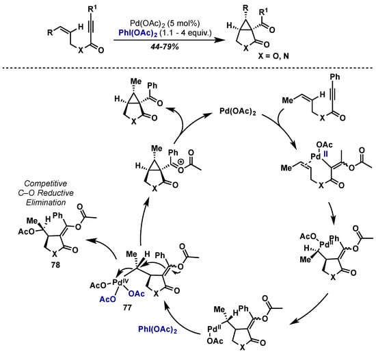 Palladium has a long and storied history in transition metal catalysis, facilitating such iconic cross coupling reactions as the Heck, Suzuki-Miyara, Negishi, Buchwald-Hartwig, Sonagashira, and others. Its ubiquity stems not only from its excellent reactivity, but also from a detailed understanding of its underlying mechanisms and predictable reactivity, which facilitates novel reaction development. For many years, palladium catalysis relied on the Pd(0)/Pd(II) redox couple, however, work in the 21st century has shown the power and promise of the high oxidation state Pd(II)/Pd(IV) manifold, as well as the potential role of Pd(III) species in catalysis (Scheme 1). This chemistry has enabled transformations previously inaccessible via traditional catalytic manifolds, most notably carbon-heteroatom bond forming reductive eliminations, the microscopic reverse of the oxidative addition pathways commonly encountered in low valent palladium catalysis. In this context, hypervalent iodine reagents have emerged as key players, facilitating net two-electron oxidations at the metal center accompanied by transfer of their heteroatom ligands, most commonly acetate or chloride. Arguably the rapid advancements and synthetic applications of high valent palladium chemistry have spurred investigations into more obscure oxidation states with other metals. As both synthetic applications and mechanistic details of this area have been comprehensively discussed in several excellent reviews in recent years [1,2,3,4,5,6,7,8], this section will discuss the key role that hypervalent iodine reagents have played in its development, with special attention paid to recent reports as well as limitations of current methods that could be addressed through continued exploration of novel oxidants. As the body of work in this area is extensive, this section will be organized based on the type of bond formation being targeted, namely C–O, C–X, C–N, and C–C bonds, and finally studies focusing on Pd(III) species.