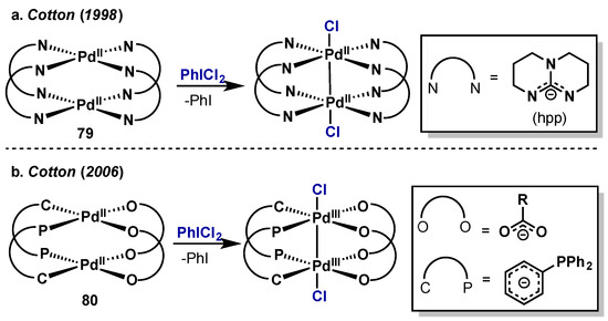 - Cotton, F.A.; Gu, J.; Murillo, C.A.; Timmons, D.J. The First Dinuclear Complex of Palladium(III). J. Am. Chem. Soc. 1998, 120, 13280–13281. [Google Scholar] [CrossRef]