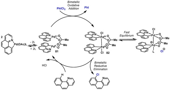 - Powers, D.C.; Geibel, M.A.L.; Klein, J.E.M.N.; Ritter, T. Bimetallic palladium catalysis: Direct observation of Pd(III)-Pd(III) intermediates. J. Am. Chem. Soc. 2009, 131, 17050–17051. [Google Scholar] [CrossRef] [PubMed]