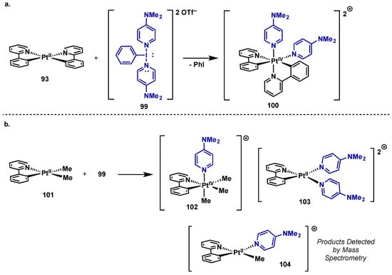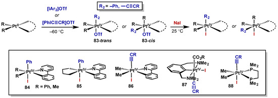 - Bayler, A.; Canty, A.J.; Ryan, J.H.; Skelton, B.W.; White, A.H. Arylation of palladium(II) and platinum(II) by diphenyliodonium triflate to form metal(IV) species, and a structural analysis of an isomer of PtIMe2Ph(bpy) (bpy = 2,2′-bipyridine). Inorg. Chem. Commun. 2000, 3, 575–578. [Google Scholar] [CrossRef]