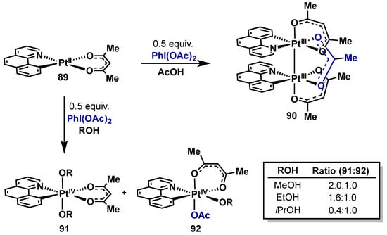 - Whitfield, S.R.; Sanford, M.S. Reactions of Platinum(II) Complexes with Chloride-Based Oxidants: Routes to Pt(III) and Pt(IV) Products. Organometallics 2008, 27, 1683–1689. [Google Scholar] [CrossRef]