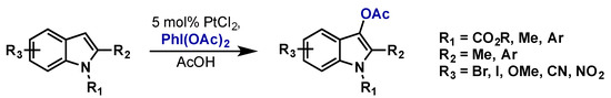 - Mutule, I.; Suna, E.; Olofsson, K.; Pelcman, B. Catalytic direct acetoxylation of indoles. J. Org. Chem. 2009, 74, 7195–7198. [Google Scholar] [CrossRef] [PubMed]