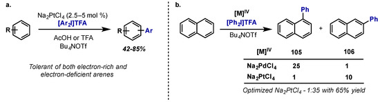 - Wagner, A.M.; Hickman, A.J.; Sanford, M.S. Platinum-catalyzed C–H arylation of simple arenes. J. Am. Chem. Soc. 2013, 135, 15710–15713. [Google Scholar] [CrossRef] [PubMed]