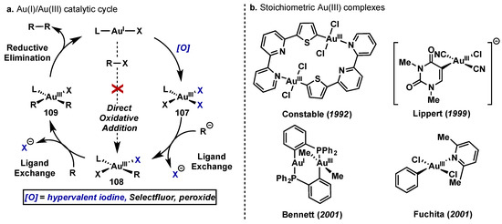 - Wu, C.-Y.; Horibe, T.; Jacobsen, C.B.; Toste, F.D. Stable Gold(III) catalysts by oxidative addition of a carbon-carbon bond. Nature 2015, 517, 449–454. [Google Scholar] [CrossRef] [PubMed]