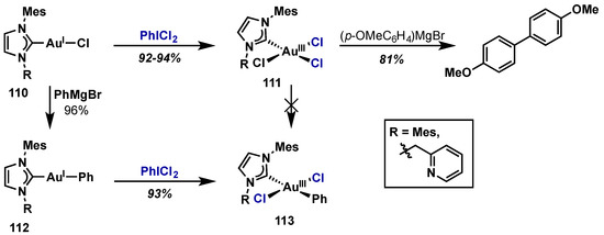 - Pažický, M.; Loos, A.; Ferreira, M.J.; Serra, D.; Vinokurov, N.; Rominger, F.; Jäkel, C.; Hashmi, A.S.K.; Limbach, M. Synthesis, Reactivity, and Electrochemical Studies of Gold(I) and Gold(III) Complexes Supported by N-Heterocyclic Carbenes and Their Application in Catalysis. Organometallics 2010, 29, 4448–4458. [Google Scholar] [CrossRef]