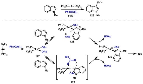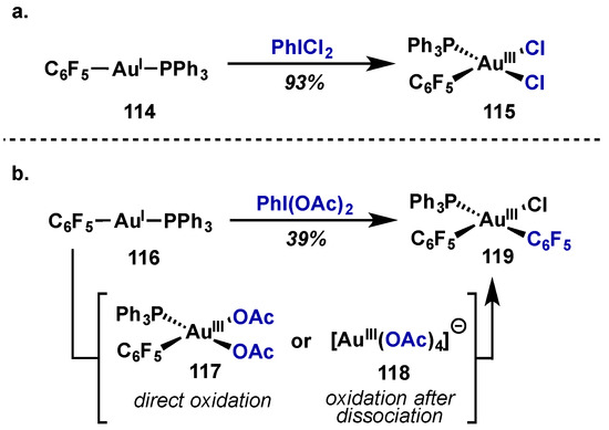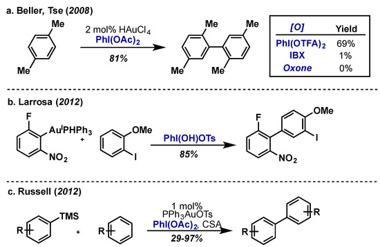 - Hofer, M.; Nevado, C. Cross-coupling of arene–Gold(III) complexes. Tetrahedron 2013, 69, 5751–5757. [Google Scholar] [CrossRef]