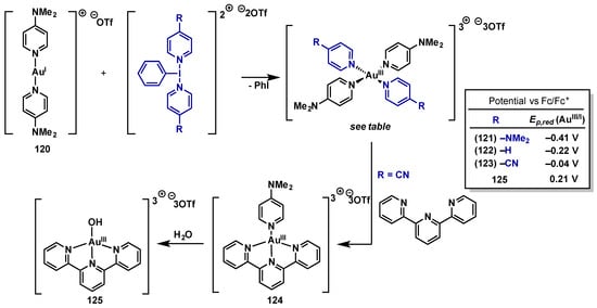 - Corbo, R.; Pell, T.P.; Stringer, B.D.; Hogan, C.F.; Wilson, D.J.D.; Barnard, P.J.; Dutton, J.L. Facile formation of homoleptic Au(III) trications via simultaneous oxidation and ligand delivery from [PhI(pyridine)2](2+). J. Am. Chem. Soc. 2014, 136, 12415–12421. [Google Scholar] [CrossRef] [PubMed]