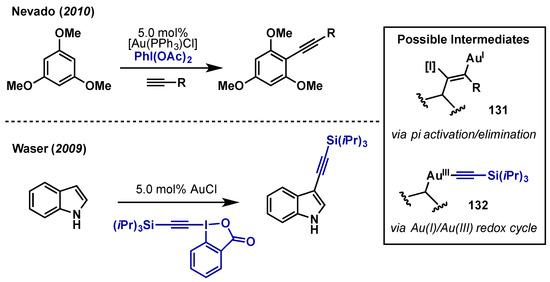 - Brand, J.P.; Li, Y.; Waser, J. Gold-Catalyzed Alkynylation: Acetylene-Transfer instead of Functionalization. Isr. J. Chem. 2013, 53, 901–910. [Google Scholar] [CrossRef]