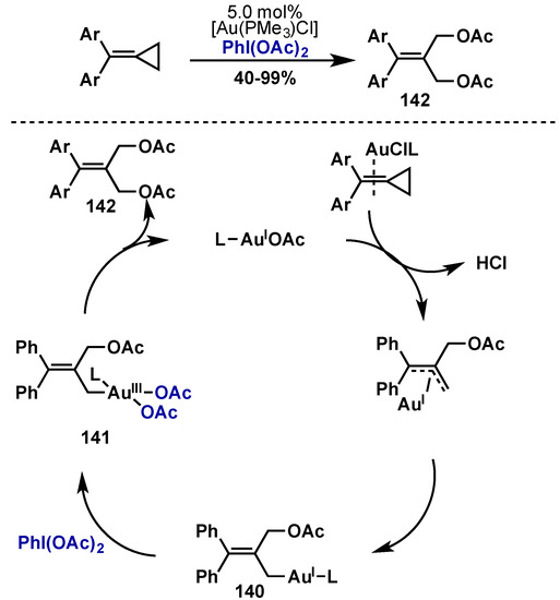 - Zhang, D.-H.; Dai, L.-Z.; Shi, M. C(sp3)–C(sp3) Bond Breaking in Methylenecyclopropanes Involving a AuI/AuIII Catalytic Cycle. Eur. J. Org. Chem. 2010, 2010, 5454–5459. [Google Scholar] [CrossRef]