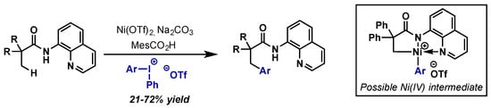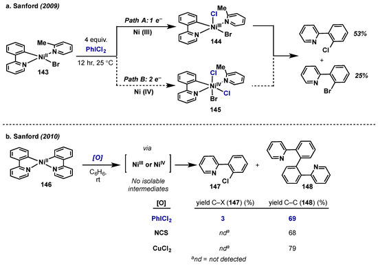 - Camasso, N.M.; Sanford, M.S. Design, synthesis, and carbon-heteroatom coupling reactions of organometallic Nickel(IV) complexes. Science 2015, 347, 1218–1220. [Google Scholar] [CrossRef] [PubMed]
