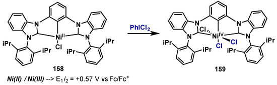 - Martinez, G.E.; Ocampo, C.; Park, Y.J.; Fout, A.R. Accessing Pincer Bis(carbene) Ni(IV) Complexes from Ni(II) via Halogen and Halogen Surrogates. J. Am. Chem. Soc. 2016, 138, 4290–4293. [Google Scholar] [CrossRef] [PubMed]