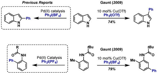 - Phipps, R.J.; Grimster, N.P.; Gaunt, M.J. Cu(II)-catalyzed direct and site-selective arylation of indoles under mild conditions. J. Am. Chem. Soc. 2008, 130, 8172–8174. [Google Scholar] [CrossRef] [PubMed]