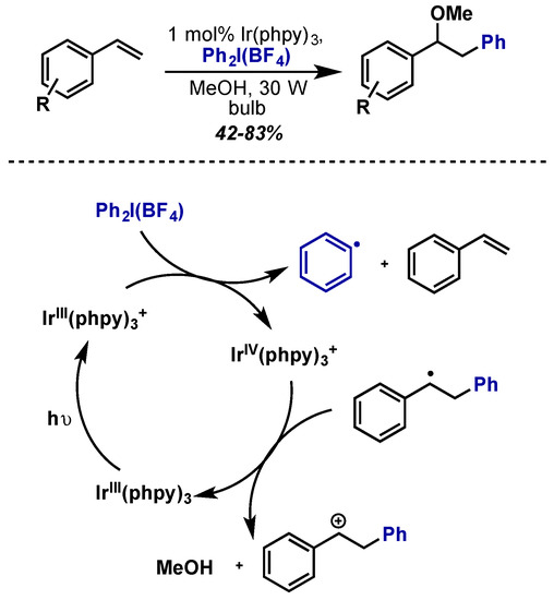 - Fumagalli, G.; Boyd, S.; Greaney, M.F. Oxyarylation and aminoarylation of styrenes using photoredox catalysis. Org. Lett. 2013, 15, 4398–4401. [Google Scholar] [CrossRef] [PubMed]