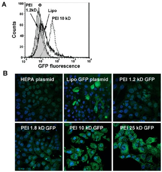 Transfection of GFP pDNA (100 ng/mL) into HEPA-1 cells with PEI-coated MSNs (25 μg/mL) or Lipofectamine as the carriers. The PEI size ranged from 1.2 kD to 25 kD as indicated in the figure. (A) Flow cytometry analysis of HEPA-1 cells; (B) Representative confocal images of HEPA-1 cells. Adapted from reference [37] with permission.