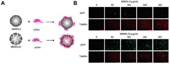 (A) Schematic illustration on preparation of DNA-MSN complexes with MMSN-2 or MMSN-23 as carriers; (B) Confocal fluorescent images of HeLa cells treated with pDNA(GFP)-MMSN-2 or pDNA(GFP)-MMSN-23. MMSNs were labeled with TAMRA. pDNA, 0.5 μg. Adapted from reference [55] with permission.