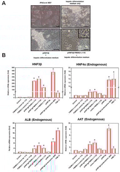 (A) Differentiation of iPSCs into hepatocyte like cells under hepatic differentiation medium supplemented with pHNF3β or pHNF3β-MSN (1/16 ratio) complexes; (B) Quantitative real-time PCR analysis of hepatocyte-specific markers, including HNF3β, HNF4α, ALB and AAT in iPSCs treated with control vector—MSN (1/16 or 1/28 ratio), pHNF3β-MSN (1/16 or 1/28 ratio), pHNF3β-Lipofectamine control, or other controls. pDNA, 1 μg/mL. Adapted from reference [46] with permission. * p < 0.05.