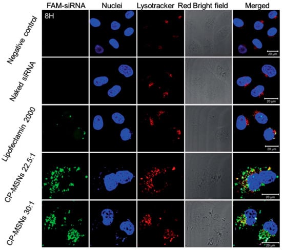 MiRNAs and siRNAs are small non-coding RNAs with lengths of ~22 nucleotides, which hold great promise in gene therapy through suppressing gene expression at the post-transcriptional level. In order to prepare miRNA/siRNA-MSN complexes for intracellular delivery of miRNAs and siRNAs, self-assmebly strategies based on the electrostatic and hydrophobic interactions between negatively charged RNAs and positively charged surface coatings were often used to load miRNAs or siRNAs onto MSNs. Similarly as DNA delivery, miRNAs or siRNAs were delivered into cells through endocytosis of miRNA/siRNA-MSN complexes and then released from the complexes into cytoplasm. For examples, as reported by Dong et al. poly(2-dimethylaminoethyl methacrylate) (PDMAEMA)-modified MSNs (CP-MSNs) were used to condense siRNAs for siRNA delivery into HeLa cells [62]. To monitor the delivery, FAM-labeled siRNA was used as the probe. Upon treatment of HeLa cells with the siRNA-MSN complexes and further measurement of fluorescent signals form siRNA and stained lysosome, they found siRNA was also detected in the lysosome, indicating the delivery of siRNA was through endocytosis pathway. Noteworthily, the delivery efficiency by MSNs was even higher than that by commercial transfection agent lipofectamine (Figure 4).