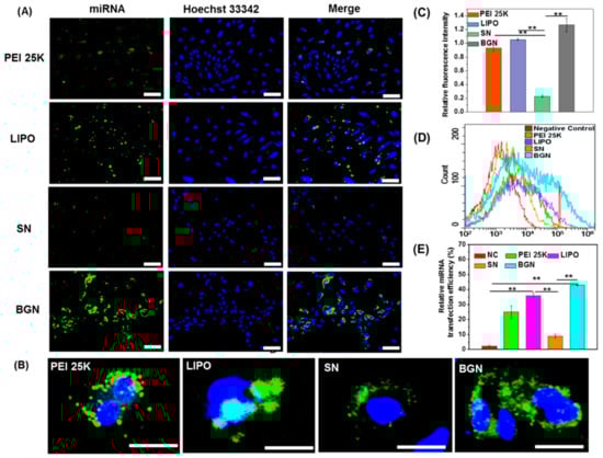 Transfection of FAM-labeled miRNA (0.26 mg/mL) into BMSCs with BGN (10 mg/mL), SN (10 mg/mL), and commercial PEI 25K and LIPO. (A) Fluorescent images of BMSCs, scale bar: 200 μm; (B) Magnified fluorescent images, scale bar: 50 μm; (C) Quantitative anaslysis of fluorescent signals in the cells; (D) Flow cytometry analysis of BMSCs; (E) Quantitative analysis of flow cytometry results. Adapated from reference [61] with permission. ** p < 0.01.