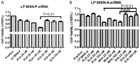 Dose-dependent effect of siRNAs against polo-like kinase 1 (PLK) and minibrain-related kinase (MirK) on viability of osteosarcoma cancer cell line KHOS cells, which were delivered by (A) LP-MSN-P or (B) LP-MSN-A. S10 that did not target PLK or MirK was used as negative control. Adapted from reference [39] with permission.