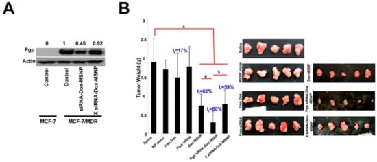 (A) Western blotting analysis of Pgp in MCF-7 cells or drug resistant MCF-7 cells post treatment with Pgp siRNA-Dox-MSNP or X siRNA-Dox-MSNP. SiRNA, 125 ng/mL; Dox, 0.4 μg/mL; MSNP, 12.5 μg/mL; (B) Sizes of tumors from drug resistant MCF-7 tumor bearing mice post treatment with control, free Dox, free siRNA, Dox-MSNP, Pgp siRNA-Dox-MSNP or X siRNA-Dox-MSNP. X siRNA indicates negative control RNAs. SiRNA, 0.024 mg; Dox, 0.08 mg; MSNP, 2.4 mg. Adapted from reference [69] with permission. * p < 0.05, relative to saline group; # p < 0.05, relative to Dox-MSNP group; $ p < 0.05, relative to X siRNA-Dox-MSNP group.