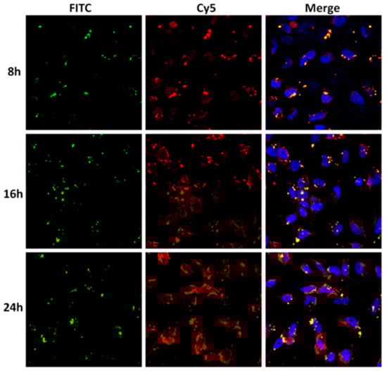 Time-dependent trafficking of the delivery and release processes of PNA delivered by MSNs into HeLa cells. Cy5 and FITC were used to label PNA and MSNs, respectively. PNA, 0.2 μM; PNA/MSN, 1/20 (w/w). Adapted from reference [70] with permission.
