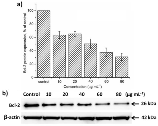 Analysis on protein expression levels of Bcl-2 after delivery of PNA into HeLa cells. (a) Quantitative analysis and (b) western blotting results of Bcl-2 protein expression levels. PNA/MSN, 1/20 (w/w). Adapted from reference [70] with permission.