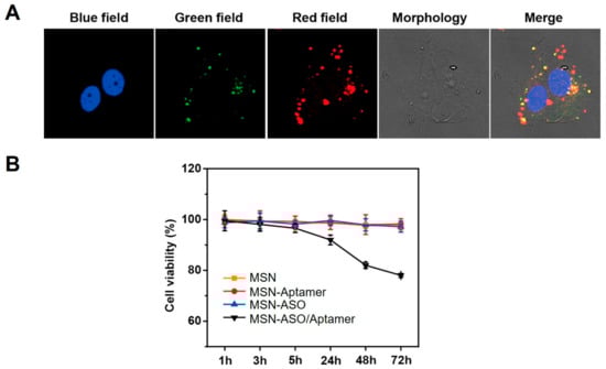 (A) Confocal fluorescent images of MCF-7 cells post treatment with MSN-ASO/Aptamer. Blue field, nucleus staining. Green field, FAM-labeled ASO. Red field, MSN fluorescence; (B) Cellular viability of MCF-7 cells post treatment with MSN, MSN-aptamer, MSN-ASO, or MSN-ASO/Aptamer. ASO, 50 nM; MSN, 100 μg/mL. Adapted from reference [71] with permission.