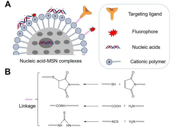 (A) Main structure and components of nucleic acid-MSN complexes; (B) Chemical strategies for conjugation of targeting ligands or fluorophores.