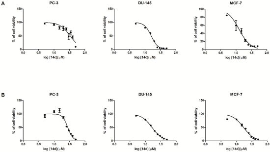 | 14c | 149.95 ± 13.45 | 106.03 ± 19.03 | 46.02 ± 5.56 | 22.48 ± 2.32 | 11.71 ± 1.87 | 8.66 ± 1.17 | 7.96 ± 0.99 | 7.83 ± 0.92 | 8.23 ± 0.98 | 15.51 |