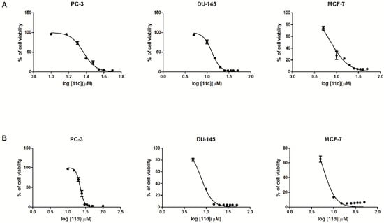 | 11c | 74.01 ± 3.18 | 27.88 ± 7.04 | 22.58 ± 1.05 | 11.25 ± 0.63 | 5.88 ± 0.33 | 4.86 ± 0.24 | 4.56 ± 0.14 | 4.73 ± 0.35 | 4.98 ± 0.19 | 7.48 |