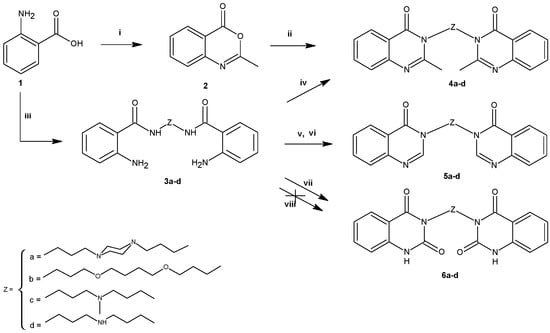 - Errede, L.A. Acylanthranils 1. The pathway of quinazolone formation in the reaction of acylanthranils with anilines. J. Org. Chem. 1976, 41, 1763–1765. [Google Scholar] [CrossRef]