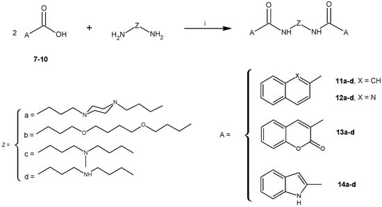 3.2.5. General Procedure for the Synthesis of 11a–d to 14a–d