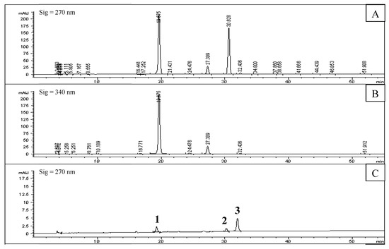 LC-MS identification: The compounds that were not matched with HPLC chromatograms of a mixture of standard compounds were separated and tentatively identified by LC-MS.
