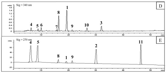 HPLC chromatograms of remaining precipitate of F. suspensa leaves (A: 270 nm; B: 340 nm), solution of screened out compounds (C: 270 nm; D: 340 nm), and mixed standard substances (E: 270 nm); 7 standard substances were completely detected at 270 nm, so 340 nm was not done) (1: Rutin; 2: Phillyrin; 4: Chlorogenic acid; 5: Caffeic acid; 8: Forsythiaside A; 9: Hesperidin; 11: Phillygenin).