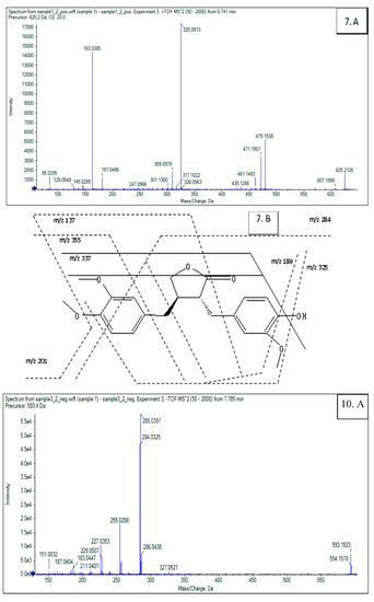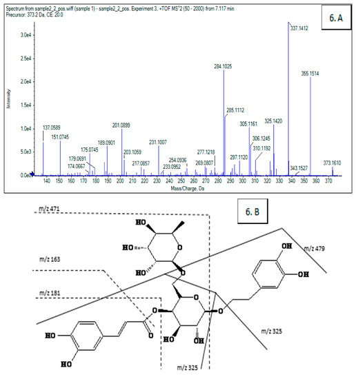 MS2 spectra (A) and fragmentation schemes (B) of Compounds 6, 7, and 10 of F. suspensa leaves. (6: Isomer of forsythiaside A; 7: Arctigenin; 10: Kaempferol-3-O-rutinose).