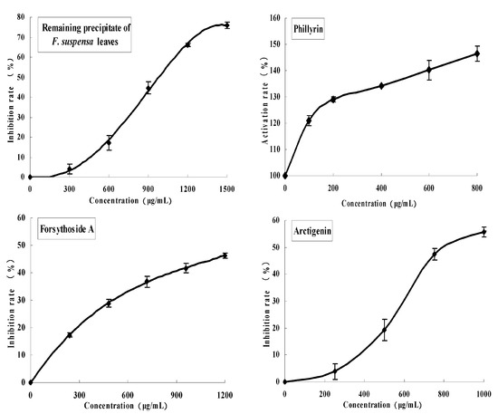 Of the eight compounds with identified structures, references [22,23,24,25] have shown the PL inhibitory activities of five compounds, including 4 (chlorogenic acid), 5 (caffeic acid), 1 (rutin), 9 (hesperidin), and 10 (kaempferol-3-O-rutinoside) (their inhibitory abilities were not tested in this study; these references only illustrated the success of this experiment system). The PL inhibitory activities of Compounds 7 (arctigenin), 8 (forsythiaside A), and 2 (phillyrin) were detected. The results are shown in Figure 4. Of these eight compounds, the inhibitory effect of kaempferol-3-O-rutinoside on PL was the strongest, with an IC50 value of 2.9 ± 0.5 μmol/L, followed by hesperidin and rutin, with IC50 values of 52.4 and 149 ± 6.0 μmol/L, respectively. The inhibitory effects of caffeic acid, arctigenin, forsythiaside A, and chlorogenic acid were lower. Interestingly, phillyrin exhibited no inhibitory effect on PL, but showed a promoting effect (see Table 3).