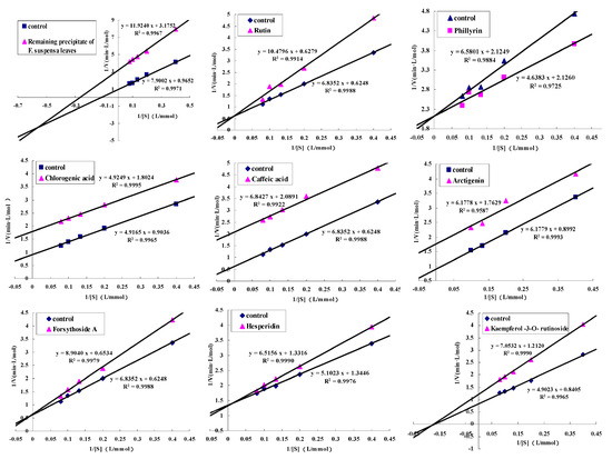 The standard curve of pNP is shown in Figure 5, the inhibition types of the remaining precipitation and the eight compounds were both detected and are shown in Figure 6. Kaempferol-3-O-rutinoside showed non-competitive inhibition. Rutin, hesperidin, and forsythiaside A showed competitive inhibition (the isomer of forsythiaside A might have the same ability). Caffeic acid, chlorogenic acid, and arctigenin exhibited uncompetitive inhibition. Phillyrin was a special compound that showed a competitive promoting effect.