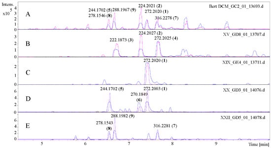 UHPLC/+ESI QqTOF MS-MS chromatograms of the CH2Cl2-extract of Anacyclus pyrethrum L. (A) c = 10 mg/mL and the selected fractions (B–E) c = 5 mg/mL. (B) fraction XV, (C) fraction XIX, (D) fraction XX, and (E) fraction XXII. All peaks are labelled with the measured m/z values and compound numbers. Blue represents base peak chromatogram m/z 100–500, and magenta represents base peak UV-chromatogram at 260 nm.